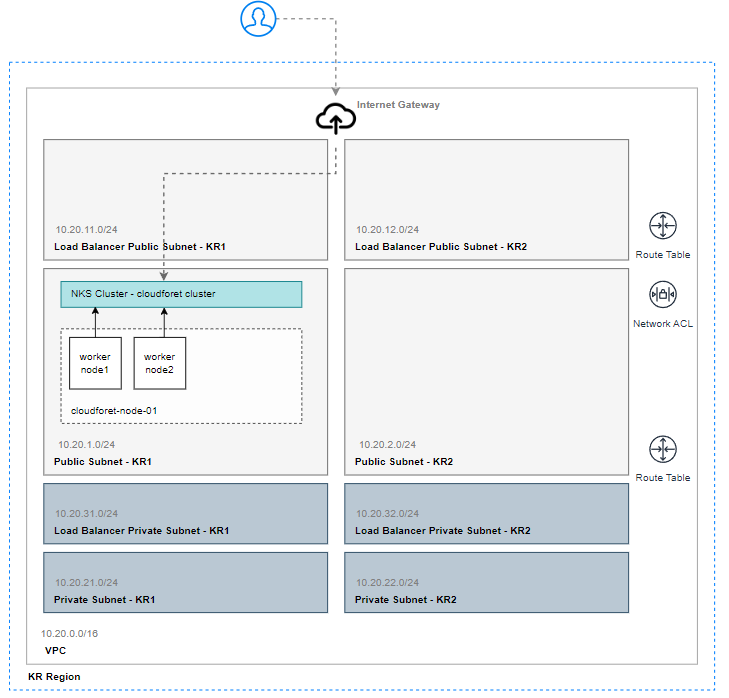 네이버 클라우드 서울 리전에 VPC를 만들고 고가용성을 위해 KR1, KR2 멀티 존으로 구성해 서브넷을 나누었다. 서브넷은 로드밸런서용 서브넷과 실제 노드들이 위치할 서브넷으로 구성했다.
